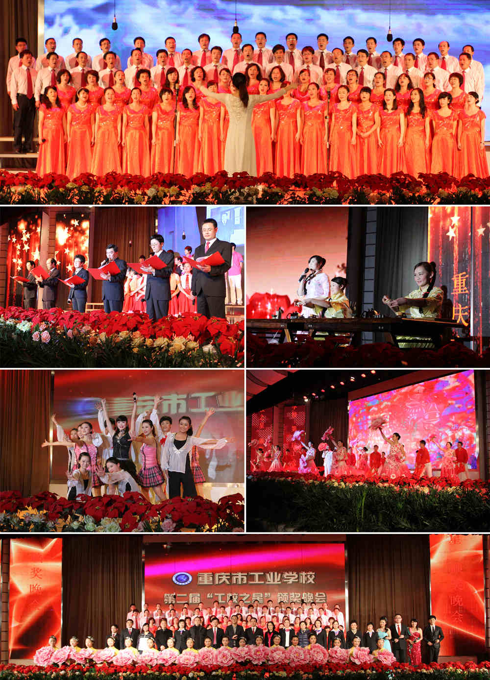 ――重庆市工业学校举办第二届“工校之星”颁奖晚会暨2013年元旦文艺汇演 2012年12月28日晚,我校第二届“工校之星”颁奖晚会暨2013年元旦文艺汇演在学校大礼堂隆重举行。学校大礼堂在新LED的辉映下显得格外绚丽、现场的气氛更加热烈,让大家在寒冷的冬日里感到了暖暖的春意与浓厚的艺术气息。重庆市委教育工委书记赵为粮、市教委副主任黎德龙、市经信委副巡员梁长禄、郑秋棠,团市委、渝中区教委、市财政局、上清寺派出所等其他部门的负责人及来宾与全校师生欢聚一堂,共同观看了这场精彩的演出。 学校校长、党委副书记杜宏伟代表学校党政领导班子向全体来宾及全校师生发表新年致辞。杜校长总结了一年全校师生在各方面取得的成绩使在座的每位师生倍感激动与振奋;她还满怀欣喜地展望了工业校的2013年,并给大家寄予新年祝福。晚会上,市委教育工委书记市教委副主任赵为粮、黎德龙为我校师生带来了新年祝福,赵书记讲到:现在职业教育尚处冬天,工业学校在办学大环境不是很尽人意的情况下上下一心,团结奋进办出了特色,办出了效益,办出了水平,成为了重庆中职学校中的排头兵。两位领导的讲话鼓舞了在场的师生,赢得了在场师生的阵阵掌声。 颁奖晚会融合了合唱、舞蹈、歌曲、礼仪展示、朗诵、音乐剧等多种艺术表演形式,充分体现了我校“红岩之光”艺术团的师生风采,穿插在其中的“工校之星”颁奖典礼环节更是把晚会推向了高潮,引人入胜。 2012年11月以来,我校开展了第二届“工校之星”的评选活动。按照发现典型、树立典型、学习典型、传播典型的要求,全校师生积极参与,形成了一股感动的热潮,纷纷推选身边的工校之星,结合候选人的事迹材料,采取全校师生投票选举的方式,最终李文静、丁小琴、孙建华、江孟莲、江映瑜、刘慎思、邓军、李晓玲、柴彬堂、吴瑶共十位同志被评选为2012年度“工校之星”。 晚会上,市经信委,市教委领导亲自为“工校之星”们颁奖,他们中,有舍弃照顾亲人、投身招生工作的教育工作者,有无私奉献的德育工作者,还有在艰辛中自强,技能突出的学生。手捧鲜花和奖杯,光荣和幸福洋溢在每一位工校之星的脸上。一张张真诚的笑脸、一个个感人的故事,一段段催人奋进的感召,给了全校师生前进的动力。 “阳光路上,无限风光,前进的脚步日夜兼程,不可阻挡…”。一曲《阳光路上》为汇演拉下了帷幕。本次文艺汇演,充分展示了学生和老师的艺术才华和创新精神,营造了文明健康、积极向上的校园文化氛围,促进了校园文化建设的健康发展,展现出了师生们喜迎新年的豪迈激情和积极向上的精神风貌。