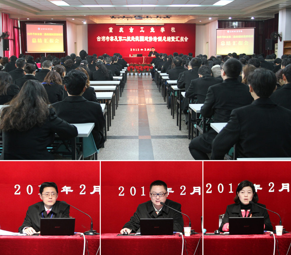 2013年2月28日下午,在重庆市工业学校多功能厅召开了台湾考察及第二批赴德国进修培训总结暨汇报会;校长、党委副书记杜宏伟,党委书记、副校长曹林,纪委书记、党委副书记况力,副校长李经祥、陈玉明、刘正瑜及全校教职员工参加了大会;会议由副校长陈玉明主持。