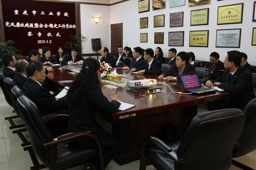 ――重庆市工业学校举行2013年党风廉政建设暨安全稳定工作责任书签字仪式 为切实落实学校党风廉政建设责任制和责任追究制,强化全方位管理,明确党政主要领导、分管领导及各部门负责人在廉政建设和安全稳定工作中的责任, 2013年4月2日下午,世纪楼三楼大会议室举行党风廉政建设暨安全稳定工作责任书签字仪式,校长、党委副书记杜宏伟,党委书记、副校长曹林,党委副书记、纪委书记况力,副校长李经祥、陈玉明、刘正瑜及在校全体中干参加了会议。 校纪委书记况力向在座同志解读了《中共重庆市工业学校委员会2013年党风廉政建设和反腐败分工责任制》(重工校委[2013]8号)文件精神,宣布了2013年学校党风廉政建设重点任务分工。 随后,学校党政主要领导与分管领导,分管领导与各部门第一责任人分别签订了党风廉政建设责任书和安全稳定工作责任书。 会上,杜宏伟校长和曹林书记分别做了作了重要讲话。他们在讲话中指出,一是要加强廉政学习,要把学校建设成学习型单位,需要全体党员干部牢固树立意识,提升思想;二是学校党委将加大党风廉政建设工作力度,规范制度,加强对建设工程和大宗物资采购的管理;三是各部门要狠抓工作落实,担当“一岗双责”加强教育,树立节约意思,强化安全责任,发挥正能量;四是学校纪委要加大力度积极监督学校各项工作的开展,为学校发展和正在建设项目打造廉政工程。 党政办公室 张志杰