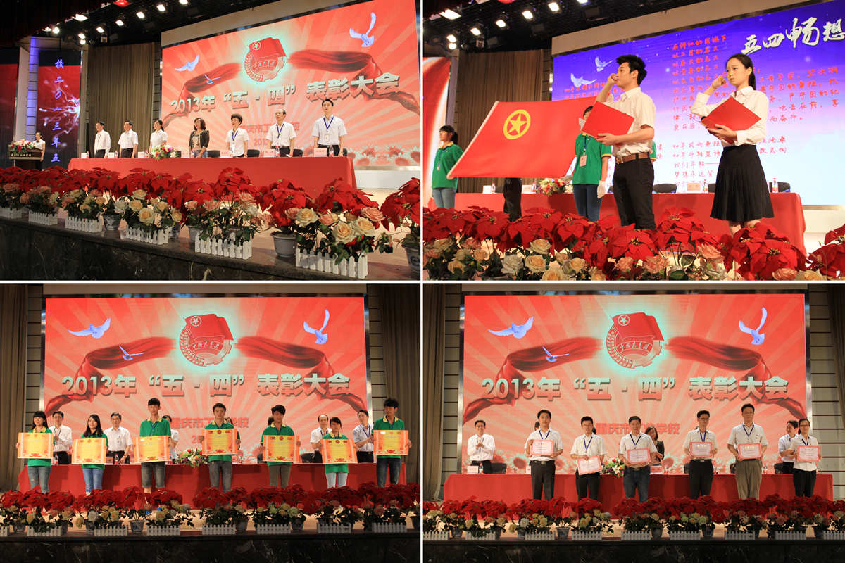 ――重庆市工业学校2013年“五・四”表彰大会 为纪念五四运动94周年,引导全校学生深刻认识和全面了解五四运动的伟大历史意义,营造校园文化氛围,传承五四精神,5月16日下午,重庆市工业学校2013年“五・四”表彰大会在校大礼堂举行。共青团重庆市委组织部部长助理胡乐,重庆市经信委团委书记刘雪梅,学校校长、党委副书记杜宏伟,党委书记、副校长曹林,党委副书记、纪委书记况力,副校长李经祥、刘正瑜及全体中干、团委委员、1000余名团员代表参加了表彰大会。大会由团委副书记李卉卉主持。 大会在朗诵《“五・四”畅想》中拉开帷幕。青年,朝气蓬勃的人!青年,我的中国!朗诵中别出心裁的穿插的新团员宣誓让会场气氛达到了高潮。会上,团委委员、化工科团总支书记万美春同志宣读了《关于批准会计121班曾晓庆等138名青年加入中国共产主义青年团的决定》,参会领导为10名新团员代表颁发了团员证。团委委员、基础科副科长罗冰雁同志宣读了《关于表彰“五・四”红旗团总支、优秀学生分会、“五・四”红旗团支部、优秀班集体、十佳优秀志愿者、优秀团干部、优秀学生干部、优秀团员、先进青年的决定》,参会领导为获奖集体和个人代表颁发了奖状和荣誉证书。随后,学校党委书记曹林同志向团员青年提出三点希望:一是进一步增强历史责任感和使命感,发奋学习,勇敢地担当起全面建设小康社会的历史重任。二是大力弘扬“五・四”精神,勇于实践,把个人的发展和学校的发展紧密结合起来。三是全校各级共青团组织要贯彻落实科学发展观精神,充分发挥组织的特色和优势,引领广大青年学生共同全面、持续发展。最后,经信委团委书记刘雪梅发表了重要讲话,对广大团员青年进行了勉励。 大会在嘹亮的《中国共产主义青年团团歌》中圆满结束。此次表彰大会,增强了团员青年的政治思想教育,培养和树立了一批先进典型,在团员青年中掀起了学知识、比技能、长才干的热潮,促进了团的工作顺利开展,凝聚了人心,鼓舞了斗志,为学校各项工作的创新发展奠定了扎实基础。