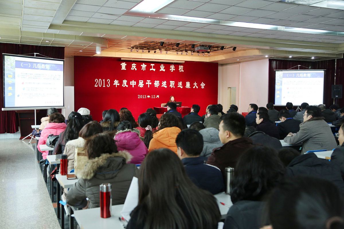 大会 为进一步健全干部监督考核体系,加强干部队伍作风建设,12月27日下午13时30分,我校在多功能厅召开2013年度中层干部述职述廉暨民主测评大会,我校校长、党委副书记杜宏伟,党委书记、副校长曹林,党委副书记、纪委书记况力,副校长李经祥,副校长陈玉明、副校长刘正瑜及学校全体教职员工参加了大会。会议由党委书记、副校长曹林主持。 会上,24名中层干部分别用PPT做了不超过5分钟的述职述廉报告,对一年以来履行岗位职责和落实党风廉政建设责任制情况进行了认真总结,并诚恳指出了自己的不足和今后努力的方向。 杜宏伟校长对本次大会进行了简单点评,她希望全体中层干部在述职述廉过程中做到数据准确、成绩客观,对部门的管理要做到建章立制、规范量化、清正廉洁,并指出中干们要通过相互交流、启发借鉴、查找不足,缩小差距,创新工作举措,取得更好成绩。接着,杜校长对寒假期间的寒假相关工作进行了部署,要求外出培训的教师们要提高认识、高度重视,学出成效;示范校项目组、综合组的同志们要锐意创新、攻坚克难,做出成果;负责寒假招生的同志们要利用资源、充分宣传,招出成绩。 会后,参会全体教职工分别对各科室工作和中层干部勤政廉政情况进行了无记名民主测评。 本次中层干部述职述廉暨民主测评大会高效有序,是党委管理、考核干部的一项重要工作,是干部自觉接受群众监督、接受教职工评价的有效形式,同时也是教职工行使民主权利、参与学校民主建设的具体体现。