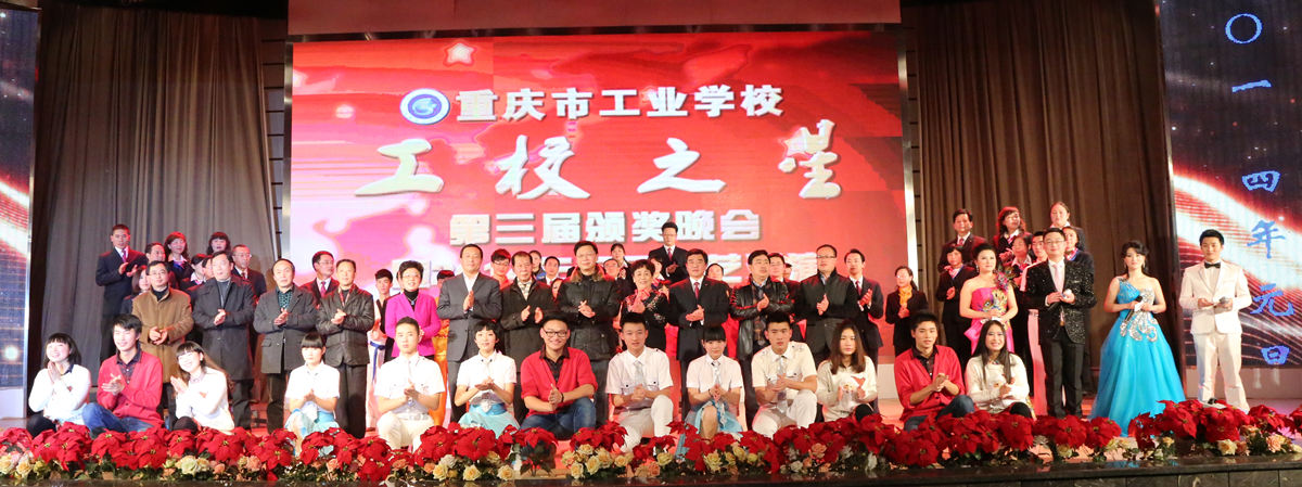 ――重庆市工业学校举办第三届“工校之星”颁奖晚会暨2014年元旦文艺汇演 2013年12月30日晚,虽然正值隆冬时节,重庆市工业学校却充满着欢声笑语和春天的气息。学校第三届“工校之星”颁奖晚会暨2014年元旦文艺汇演在学校大礼堂隆重举行。重庆市经济信息委党组成员、副主任尹华川,市教委副主任黎德龙,市经信委教培处、市教委职成教处、市职教学会、渝中区教委相关负责人以及来自教育科研、院所的职教专家和行业、企业专家们与全校师生欢聚一堂,共同欣赏了这场精彩的视听盛宴。 学校校长、党委副书记杜宏伟代表学校党政领导班子向来宾们和全校师生简单总结了一年学校在各方面取得的成绩,并代表学校向一年来,在平凡工作岗位上做出了不凡业绩的教职工们致予了新年的祝福,希望全校教职工在新的一年里,共同携手,同心同德、拼搏进取、努力实现我们的工校梦、名校梦。市经济信息委党组成员、副主任尹华川为我校师生带来了亲切的慰问和诚挚的祝福,尹副主任讲到:2014年全市工业和信息化大会的召开,为2014年重庆工业和信息化产业的发展吹响了改革前进的集结号,富民兴渝,人才先行,希望作为委系统规模最大重庆市工业学校师生能众心成城,团结一心,以人为本,办出特色,秉承优良的学风和校风,不断加强教师队伍建设,努力增强学生的创新精神和实践能力。为企业输送更多“用得上、留得住”的技能人才、成为重庆工业经济实用型技术人才的摇篮。在新一轮的学校建设发展进程中,乘风破浪,再创辉煌!为实现大家的“中国梦”,发奋图强! 颁奖晚会集合唱、舞蹈、啦啦操、朗诵、情景剧等多种艺术表演为一体,精彩纷呈,穿插在其中的“工校之星”颁奖典礼环节更是赢得了在场师生的阵阵掌声。2013年11月以来,我校开展了第二届“工校之星”的评选活动,经过全校师生投票选举,陈雅娟、郭建明、邱国声、吴静、程康、孙永佳、殷利明、曾艳艳、李卉卉、曾平龙共十位同志被评选为2013年度“工校之星”,他们中,有昼夜工作、投身示范校建设的教育工作者,有无私奉献、一心为学生的德育工作者,还有在自强不息,技能突出的学生。他们作为学校师生中的佼佼者,充分展示了我校师生的创新精神和精神风貌。市经济信息委和市教委领导为“工校之星”们颁奖,手捧鲜花和奖杯,每一位工校之星脸上都洋溢着幸福,台下的掌声、欢呼声充满了整个礼堂。 “寻梦的道路漫长,我们只争朝夕,前行的路上珍爱每一处风光…”。在《梦想》朗诵词中,文艺汇演拉下了帷幕,但他带来的温暖和正能量,久久的在校园回荡。