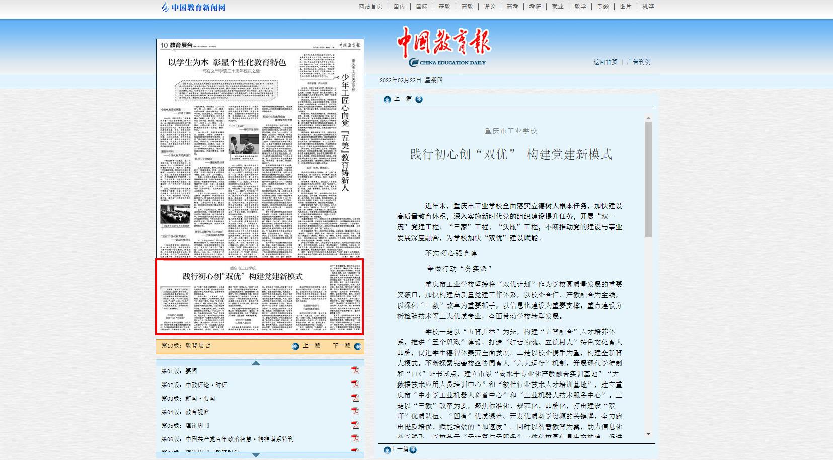 近年来,重庆市工业学校全面落实立德树人根本任务,加快建设高质量教育体系,深入实施新时代党的组织建设提升任务,开展“双一流”党建工程、“三家”工程、“头雁”工程,不断推动党的建设与事业发展深度融合,为学校加快“双优”建设赋能。