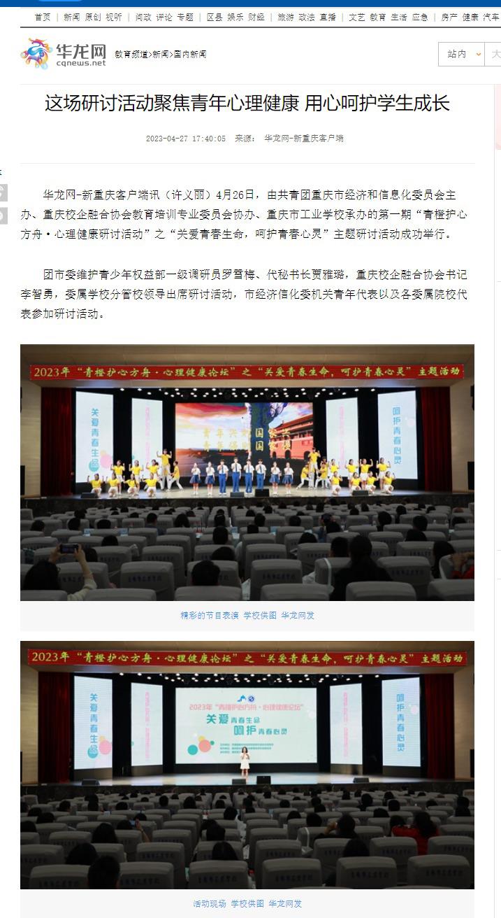 华龙网-新重庆客户端讯(许义丽)4月26日,由共青团重庆市经济和信息化委员会主办、重庆校企融合协会教育培训专业委员会协办、重庆市工业学校承办的第一期“青橙护心方舟·心理健康研讨活动”之“关爱青春生命,呵护青春心灵”主题研讨活动成功举行。